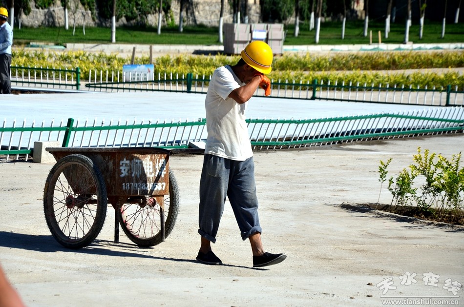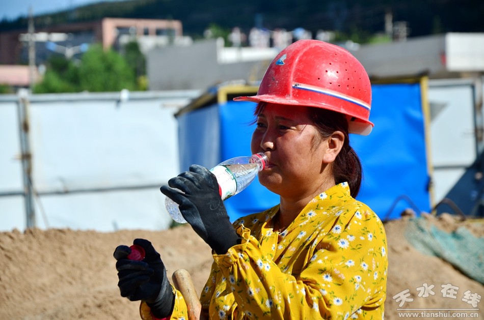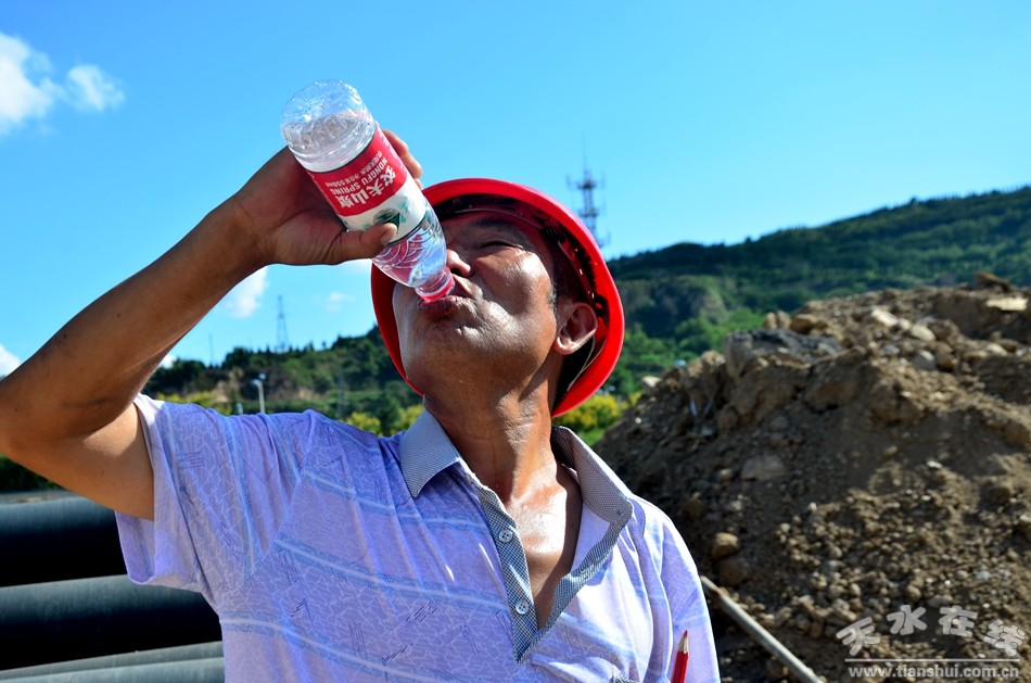 ▲天水在線向高溫下的勞動(dòng)者送上礦泉水